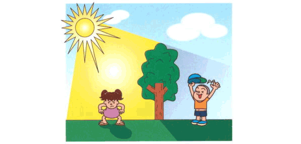 この例で説明しますと、太陽から届いた電磁波(遠赤外線)が葉っぱに当たり、葉っぱは熱くなります。ただ、そこで電磁波がカットされますので、男の子に届く電磁波が少なくなり、「涼しく感じる」、というわけなのです。