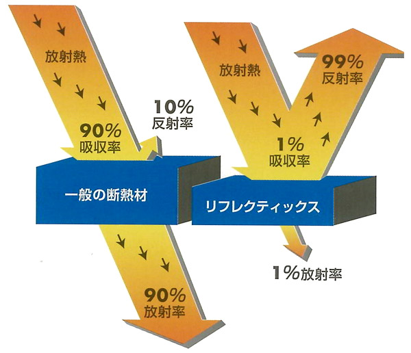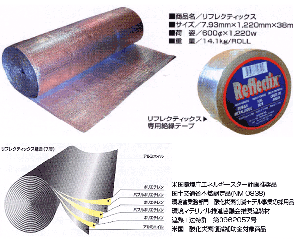 このリフレクティックスは高純度のアルミを使った遮熱材で、輻射熱を99%反射し、建物の温度を大きく下げます。