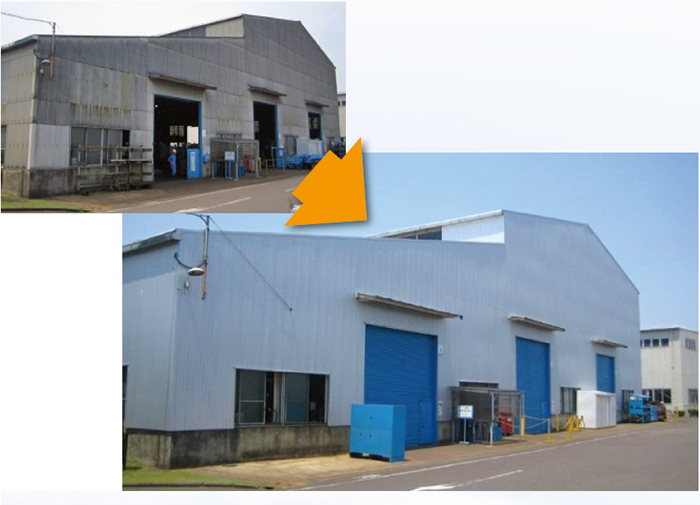 梅干しなどの販売を行っている株式会社ウメカ食品様。スレート工場の老朽化で悩まれていた大谷社長から相談を受け、工場の改修を受け持たせていただきました。
