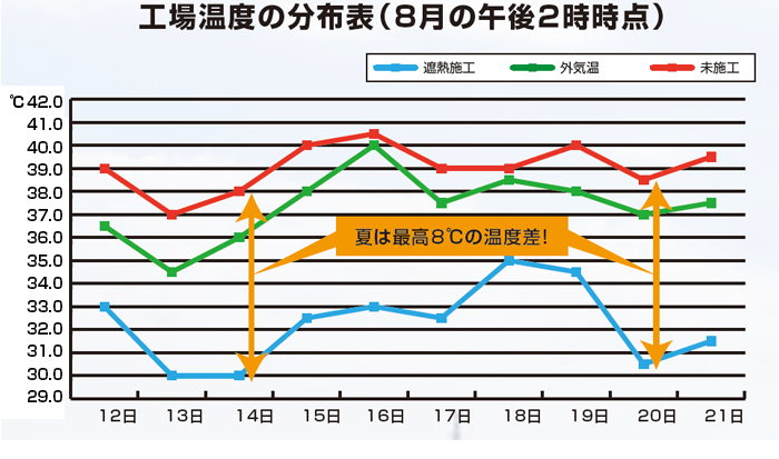 リフレクティックスを導入することで、室内温度がスレート屋根の状態と比べ、最高約8℃下がりました。